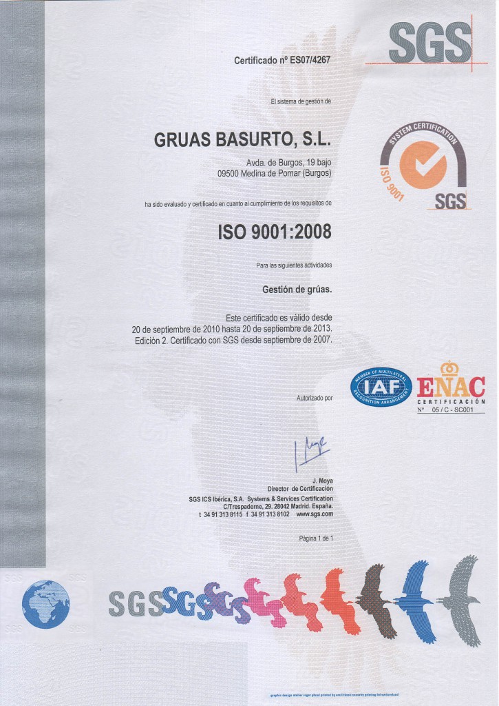 Como consecuencia de una de las estrategias más importantes de la empresa y al compromiso ineludible de dar la mejor calidad a nuestros clientes, el 20 de Septiembre de 2007 GRUAS BASURTO, SL obtiene el certificado de calidad de GESTION DE GRUAS según la norma ISO 9001 después de pasar con éxito su auditoria.